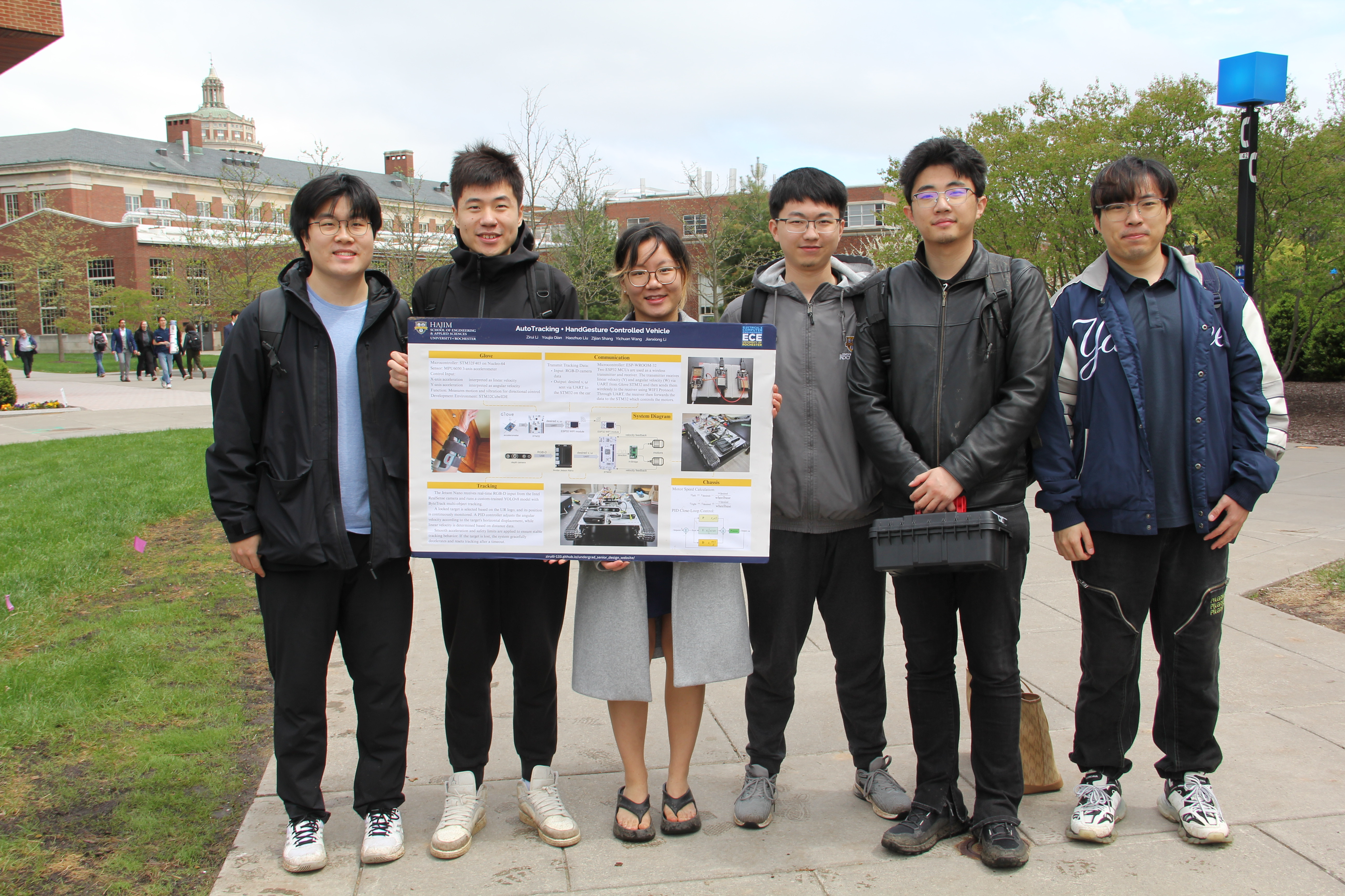We present a hybrid control system for a tracked vehicle that supports both gesture-based manual control and autonomous person tracking. The system enables users to steer the vehicle using a glove equipped with an STM32 microcontroller and MPU6050 accelerometer, which translates hand motions into real-time velocity commands via Wi-Fi communication. For autonomous operation, the vehicle uses an Intel RealSense RGB-D camera and a Jetson Nano running a YOLOv8-based object tracker to identify and follow a designated person. Linear and angular velocities are computed based on relative distance and lateral displacement, and a PID controller ensures smooth and accurate motor control through an STM32-based embedded system. This design enables flexible and intuitive human-vehicle interaction for assistive and robotic applications.